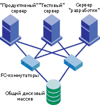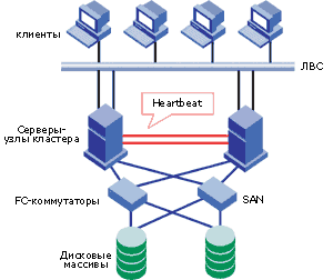 Кластер состоит из аппаратной и программной частей. Аппаратная часть помимо узлов кластера, т. е. самих объединенных серверов, включает среду их взаимодействия – heartbeat, реализуемую с помощью либо обычного Ethernet, либо специальных высокоскоростных сред передачи данных с низкой латентностью, таких, как SCI, HP HyperPlex, Sun WildCat. Для того чтобы все узлы кластера могли обеспечить работу одного информационного сервиса, они должны иметь доступ к общему дисковому пространству. Оно реализуется созданием общих для узлов кластера томов на одном отказоустойчивом дисковом массиве (или двух зазеркалированных дисковых массивах), подключенном ко всем узлам кластера. Для кластера, состоящего из многих узлов, наилучшей инфраструктурой доступа серверов к общему дисковому массиву является сеть хранения данных (SAN), поскольку протокол SCSI не обеспечивает устойчивой работы шины более чем c двумя инициаторами.