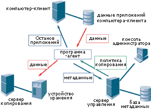 - один или несколько серверов копирования данных, к которым подключены устройства резервного хранения данных;