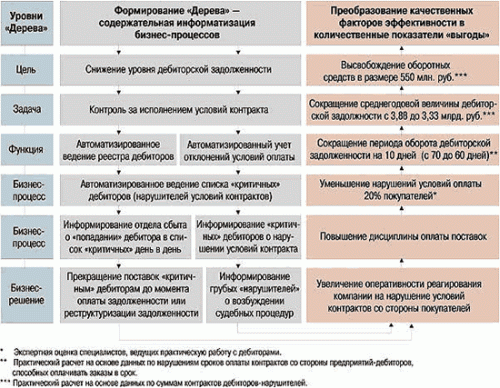А ИТ-проекты, рационализируя управленческие бизнес-процессы, позволяют получать такие качественные улучшения, как сокращение дублирующих функций; повышение оперативности, ликвидация излишних бизнес-операций, увеличение оперативности расчетов; сокращение сроков формирования отчетных документов, увеличение возможностей по оптимизации решений за счет многовариантных расчетов и др. Можно понять, что, например, ускорение расчетов приведет к снижению показателя "средства в расчетах", а это, в свою очередь, к высвобождению оборотных средств. Однако напрямую связать, скажем, увеличение прибыли со скоростью формирования отчета по дебиторам компании практически невозможно. Очевидно, что прямого однозначного соответствия между конечными финансово-экономическими выгодами и качественными улучшениями за счет информатизации провести нельзя. Выход - в структуризации конечных финансово-экономических целевых показателей до уровня ИТ-процедур.