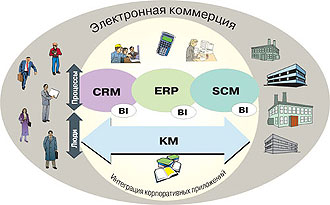 В качестве примера на рисунке проиллюстрирована общая взаимосвязь информационных систем ERP (в традиционной трактовке), CRM, SCM, BI (business intelligence - поддержка принятия решений) и KM (knowledge management - управление знаниями) на предприятии, работающем в сфере электронной коммерции.