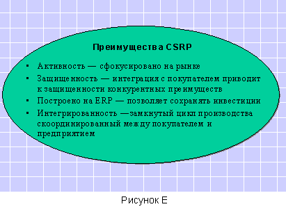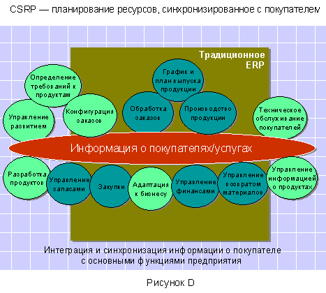CSRP устанавливает методологию ведения бизнеса, основанную на текущей информации о покупателе. CSRP сдвигает фокус предприятия с планирования от потребностей производства к планированию от заказов покупателей. Информация о покупателях и услуги вплавляются в основу организации (смотри рисунок D). Деятельность по производственному планированию не просто расширяется, а удаляется и заменяется запросами покупателей, переданными из подразделений организации, ориентированных на работу с покупателями.