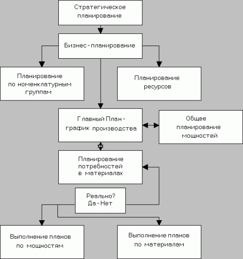 В основу MRP II положена иерархия планов. Планы нижних уровней зависят от планов более высоких уровней, т.е. план высшего уровня предоставляет входные данные, намечаемые показатели и/или какие-то ограничительные рамки для планов низшего уровня. Кроме того эти планы связаны между собой таким образом, что результаты планов нижнего уровня оказывают обратное воздействие на планы высшего уровня.
