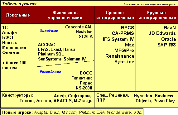 Классификация может быть проведена по множеству различных критериев. Мы постарались сохранить ее как можно более похожей на вариант, предложенный в конце 1998 года. Другие возможные варианты классификации - по вертикальным рынкам (смотри ниже), по обобщенным функциональным возможностям, по техническим характеристикам, по годовому обороту, количеству внедрений, темпам роста и пр.